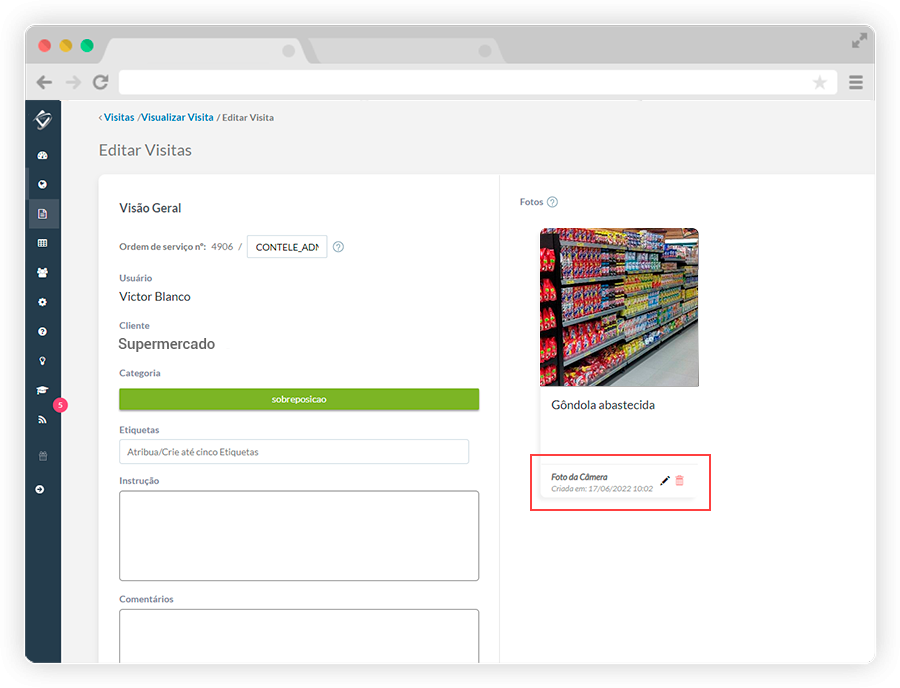 É possível inserir comentários nas fotos tiradas durante as visitas pelo próprio aplicativo do usuário. O gestor, se desejar, pode visualizar e editar os comentários pelo sistema.